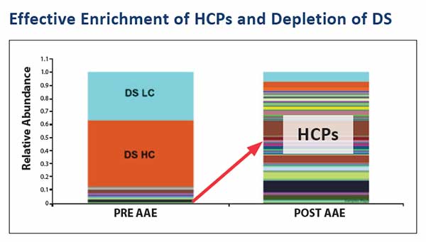 Identification and quantification of HCPs by mass spectrometry is a powerful complementary method to ELISA, however drug products often mask HCPs by a factor of 104-106. When combined with AAE as a sample preparation step to enrich HCPs and eliminate most of the DS, MS sensitivity is highly improved.