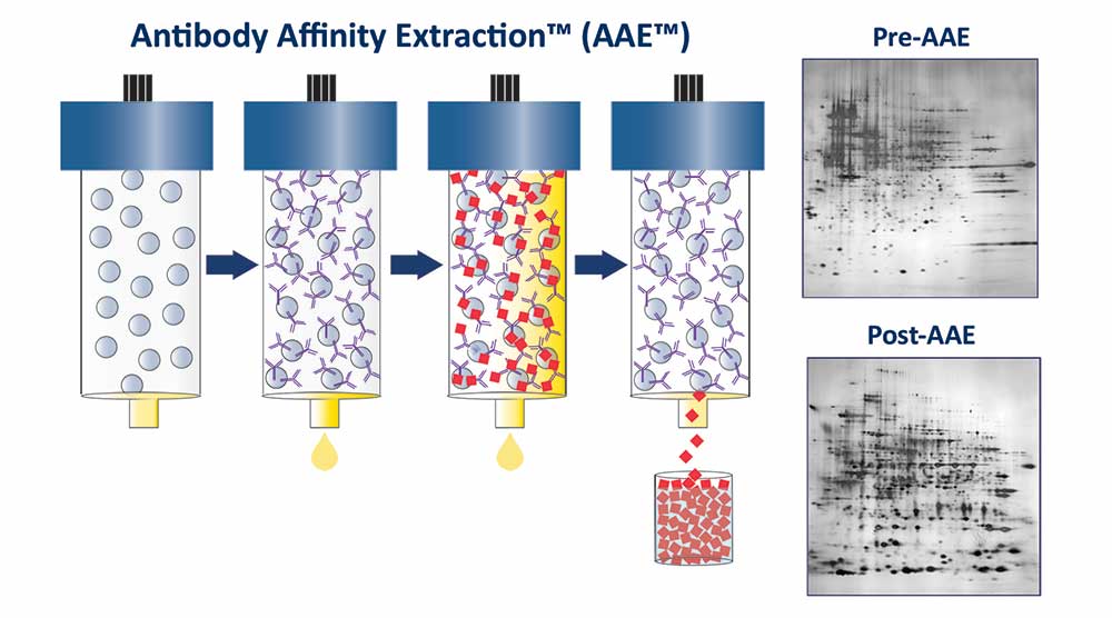Antibody Affinity Extraction is a method devised by Cygnus Technologies to overcome the technical challenges and limitations of other orthogonal methods such as 2D Western blot and 2D-DIBE in assessing the coverage of a polyclonal antibody to total host cell protein (HCP). In this method the polyclonal antibody is covalently immobilized on a chromatography support. The column is then conditioned to prevent significant leaching of the antibody and to greatly minimize any non-specific binding. The HCP sample in its native, undenatured state is passed over the column for binding and then eluted with acid. The HCP sample is again cycled over the column by binding and elution until no additional HCP is bound. All HCP elution fractions are pooled, buffer exchanged, and concentrated back to the original sample volume. The final sample is then separated by 2D SDS PAGE and analyzed by either a comparison to a silver stain of starting, unextracted sample or by Differential Gel Electrophoresis (DIGE) using Cy3 and Cy5 to label the extracted and starting, unextracted samples.