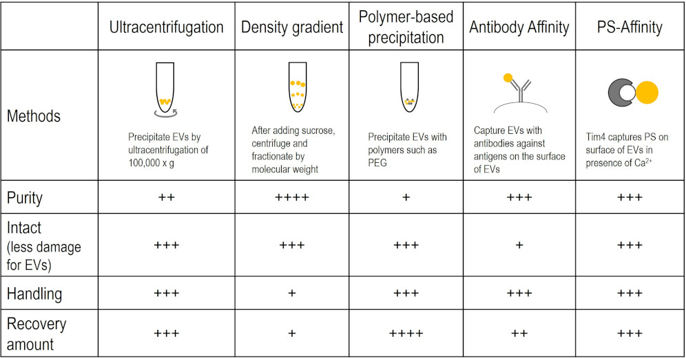 Various methods are available to isolate extracellular vesicles (EVs), such as ultracentrifugation, density gradient centrifugation, and polymer-based precipitation. However, these methods have some drawbacks, e.g. low recovery efficiency, low purity, inability to collect intact vesicles, and poor reproducibility.