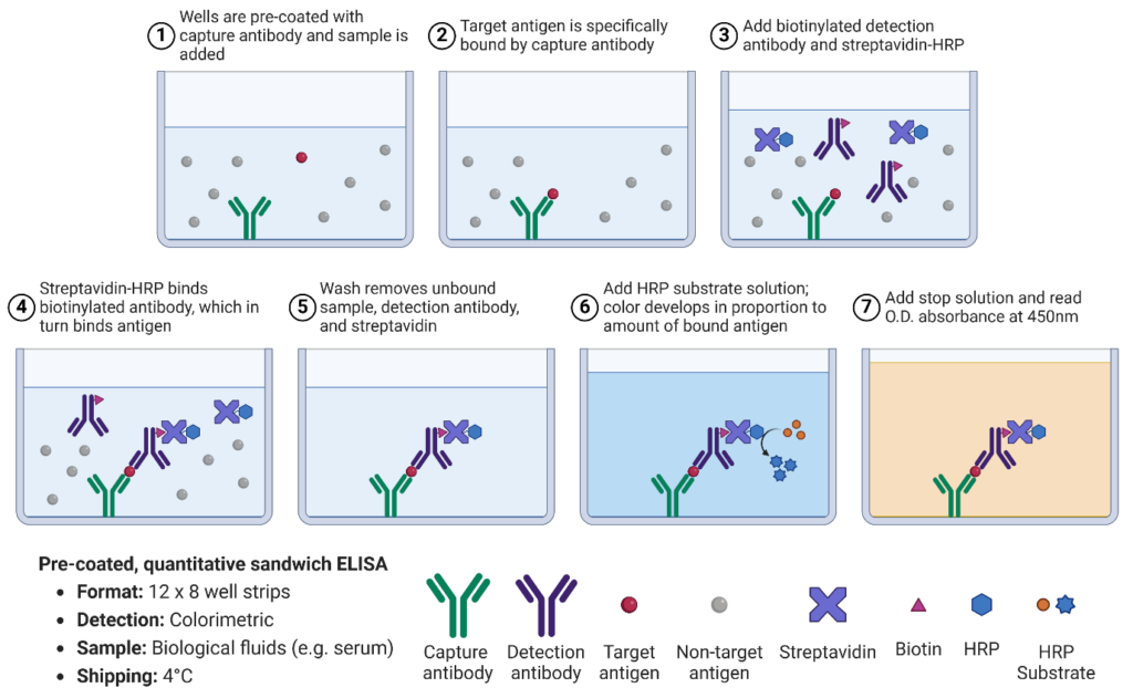 The enzyme-linked immunosorbent assay (ELISA) has become the standard method for in vitro quantification of target antigens in biological fluids, thanks to the high specificity of the antigen-antibody interaction. This is particularly relevant in sandwich ELISAs, in which matched pairs of antibodies bind an antigen (the sandwich “filling”) at two distinct sites, increasing specificity.