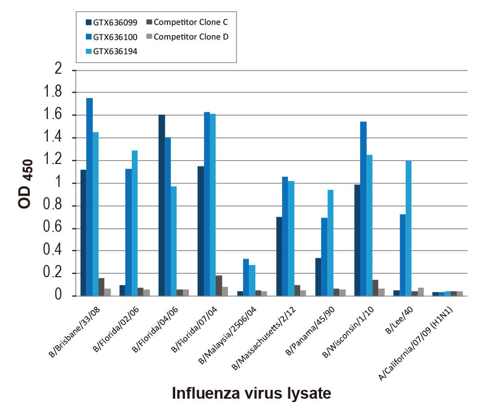 GeneTex has released three clones, each for influenza A and B nucleoproteins. The nucleoprotein is conserved in different variants and therefore a suitable target for detecting the virus antigen. GeneTex’s nucleoprotein antibodies have been tested for sandwich ELISA using recombinant nucleoproteins, and showed a low picomolar range sensitivity. The Flu A pairs can detect at least 16 strains of virus lysates, and the Flu B pairs have been tested on 7 strains of virus lysates. The influenza A antibodies showed no cross reactivity to influenza B, and the influenza B antibodies showed no cross reactivity to influenza A.