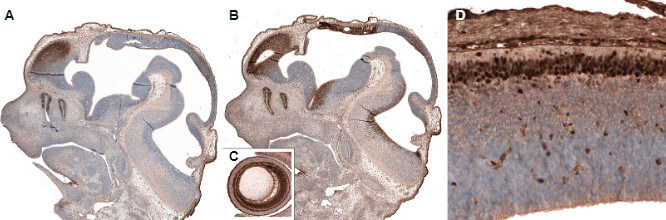 Figure 1: Tissue expression of selected transcriptional factors involved in the development of cerebral cortex. Immunohisto-chemical staining with Anti-LHX2 antibody (AMAb91404) shows strong immunoreac-tivity in the developing cortex and sensory organs of mouse embryo E11 (A). PAX6 expression is detected in both developing brain and sensory organs (B), including eye (C) (AMAb91372). MEF2C is primarily expressed in the upper layers of the developing cortex, as shown by the anti-MEF2C antibody (AMAb90728) in mouse embryo E14 (D).