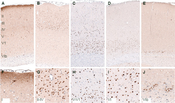 Figure 2: Laminar distribution of protein expression profiles in the cerebral cortex of rat. RELN immunoreactivity is mainly detected in the neuropil of layer I (AMAb91365) (A, F). CUX1 expression is seen in layers II-IV (HPA003277) (B, G). BCL11B (CTIP2) is expressed primarily in layers V and VI (HPA049117) (C, H). Layer VI neurons show strong expression of FOXP2 (AMAb91362) (D, I). Finally, layer VIb can be identified by presence of CTGF im-munoreactivity (AMAb91366) (E, J).