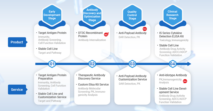 ADC drug development process includes target selection, antibody discovery & optimization, quality control, etc. Cusabio provides tailored products, services, and solutions to meet researchers’ needs at every stage.