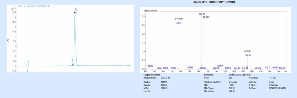 The purity of Thymalfasin (Cat. No. HY-P0091) was more than 99% and the molecular weight of this molecular weight of the peptide was around 3108.3 g/mol verified by Mass Spectrometry.