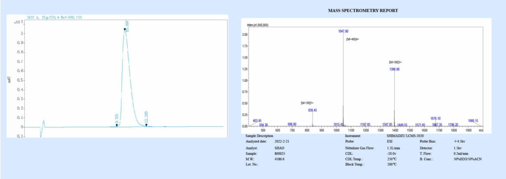 The purity of Exendin-4 (Cat. No. HY-13443) was more than 99% and the molecular weight of the peptide was around 4186.6 g/mol verified by Mass Spectrometry.