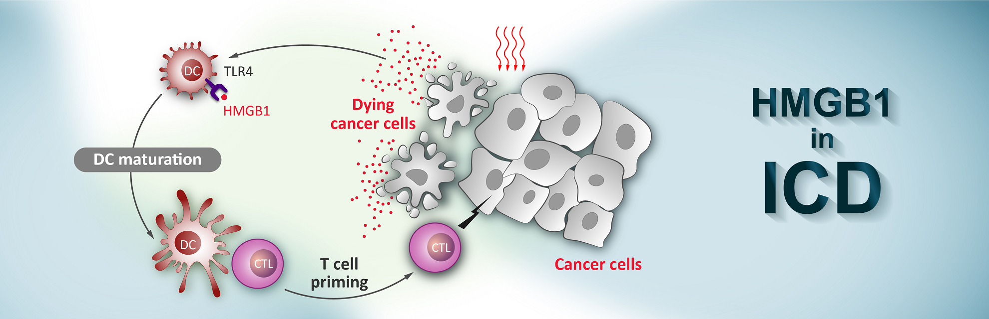ICD is a form of cell death resulting in an activation of immune response. ICD is triggered by damage-associated molecular patterns (DAMPs) such as exposure of calreticulin (CRT) at plasma membrane and release of HMGB1 and ATP. DAMPs contribute to the maturation of dendritic cells (DCs), which present antigens to CD8+ T cells, leading to activation of adaptive immunity. Accumulated reports reveal that irradiation or chemotherapy not only results to cancer cell death but also induces immunological anti-tumor responses via ICD. It is believed that the combination of ICD induction and other anti-cancer therapy is a promising approach for cancer treatment.