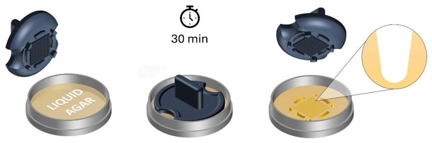 Stampwell U-Shape is a stamp designed to easily create U-bottom wells in any type of hydrogels such as agarose, alginate, phytagel, methycellulose, etc. This forms an array of non-adherent wells in which cell suspension can be loaded to watch cell aggregate in individual 3D cell structures.
