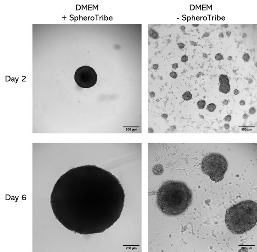 SpheroTribe is a concentrated polymer-based solution that increases the medium viscosity, therefore favouring cell-cell contacts. It offers a simple method to generate homogeneous 3D cell structures with increased control over their shape, minimizing variability between samples and improving the consistency of your downstream experiments such as migration/invasion assays, immunostaining, drug screening or in vivo implantation experiments. SpheroTribe is particularly useful to boost aggregation when working with challenging cells.