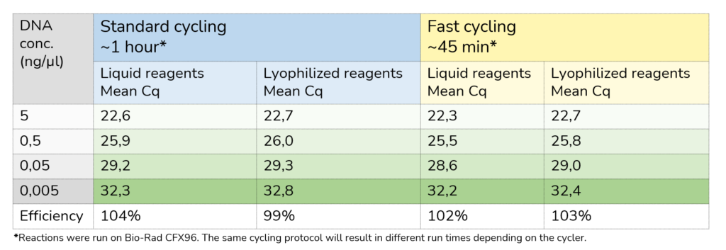 Given the inclusion of the SolisFAST® DNA Polymerase in this product, which has very fast extension rates, tests were also conducted to evaluate its performance with both standard and fast cycling protocols in both liquid and lyophilized forms. The results show that the Cq values obtained with all the tested conditions are very persistent. Therefore, it can be confidently said that SolisFAST® Lyo-Ready qPCR Kit with UNG can produce consistent values before and after lyophilization with both standard and fast cycling protocols.