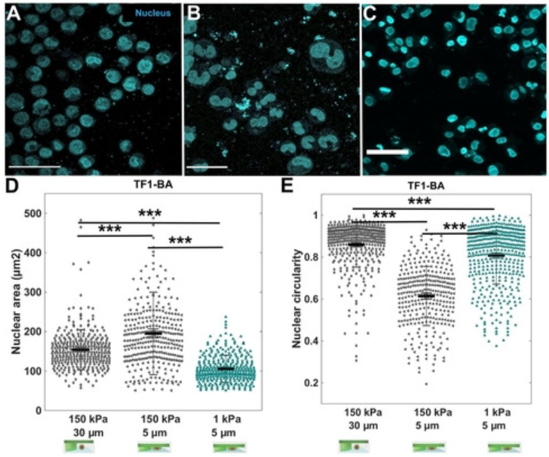 Influence of agarose stiffness on nuclear deformability. In situ immunostaining of TF1-BA cell nucleus (cyan) after 3 days in the soft cell confiner molded in (A) standard agarose (storage modulus of 150 kPa) with 30 μm pillars (no confinement); (B) standard agarose with 5 μm pillars (confinement) and (C) ultra-low agarose (storage modulus of 1 kPa) with 5 μm pillars. Scale bar = 100 μm. (D and E) Corresponding quantification of nuclear circularity and nuclear area of TF1-BA cells for the three conditions. At least 150 nuclei were analyzed per condition. Reproduced from Lab Chip, 2020,20, 4016-4030 with permission from the Royal Society of ChemistrySet-up mimicking the complexity of the tumor microenvironment. (A) Schematic representation of the two layers of cells inside the soft cell confiner. (B and C) Representative confocal images of leukemic cells (ML2, red) seeded on top of stroma cells (HS27A, blue) and inserted into the confiner with a height greater than both layers (h = 30 μm, unconfined, B) or smaller (h = 9 μm, confined, C) for 3 days. Scale bar = 50 μm. (D) Bar graph showing ML2 cell area quantification from unconfined (A, the average projected area of 216 ± 133 μm2) or confined (B, the average projected area of 329 ± 155 μm2). (E) Representative FACS plots following 3 days confinement in co-culture analyzed for cell content in HS27A-Turquoise and ML2-Cherry. Reproduced from Lab Chip, 2020,20, 4016-4030 with permission from the Royal Society of Chemistry