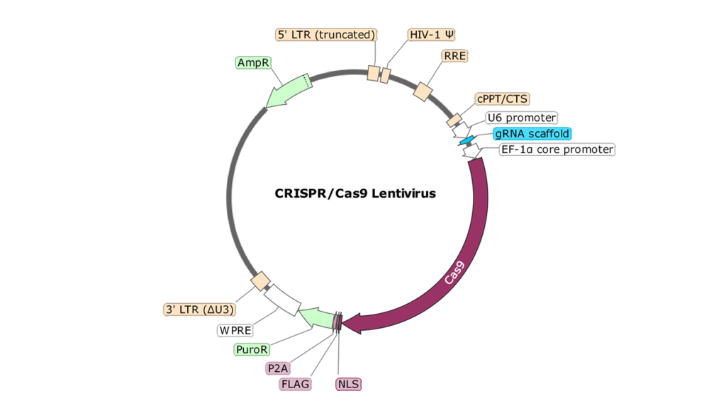 The lentiviruses are replication incompetent, VSV-G pseudotyped lentiviral particles ready to infect almost all types of mammalian cells, including primary and non-dividing cells. The SIN (self-inactivation) lentiviral backbone contains the Cas9 gene (Streptococcus pyogenes CRISPR associated protein 9) driven by an EF1a promoter, an sgRNA driven by a U6 promoter, and a puromycin selection marker.