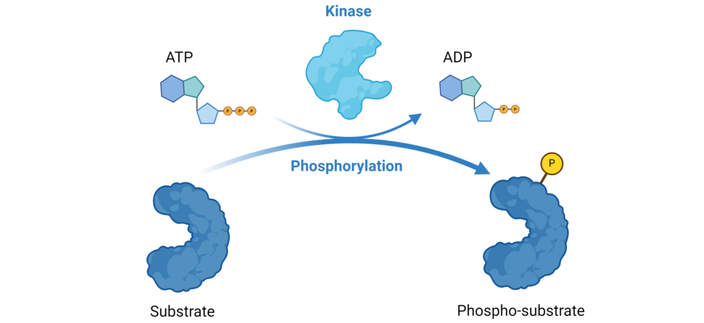 Protein phosphorylation regulates many cellular processes including cellular division, metabolism, signal transduction, and more. There are over 500 kinases encoded by the human genome and it has been estimated that kinases regulate approximately 50% of all cellular functions.