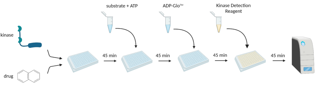 BPS Bioscience’s Chemi-Verse Kinase luminescent assays work by measuring the amount of ADP produced by a kinase upon phosphorylation of a substrate. The assay involves two simple steps. First, the addition of the ADP-Glo™ reagent stops the reaction and quenches any remaining ATP. Then, the Kinase Detection reagent is added to convert the ADP produced into ATP, which is subsequently quantified through a luciferase reaction. The luminescent signal correlates with the amount of ADP generated by the kinase and is linear up to 1 mM ATP.