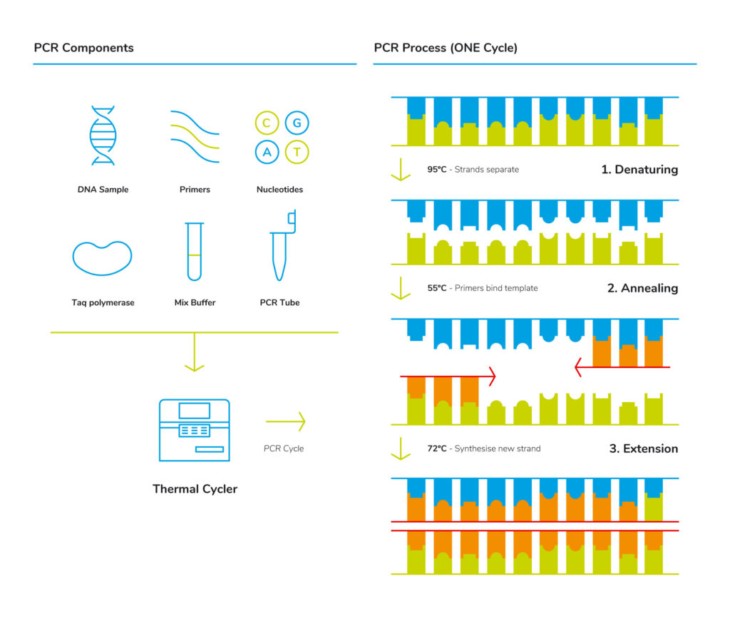 1. Denaturing of the DNA chains – DNA is heated to ~95 °C where the DNA double helix is separated into two individual DNA strands.