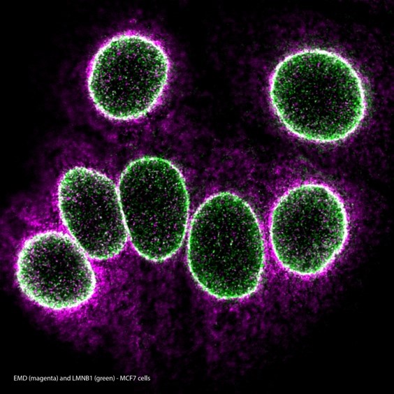 Left: EMD/LMNB1 MolBoolean staining in MCF7 cells