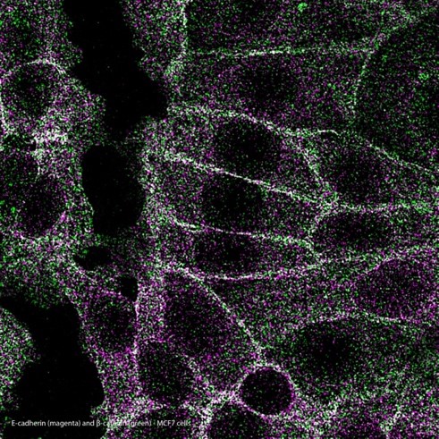Left: E-cadherin/ β-catenin MolBoolean staining in MCF7 cellsMolBoolean analysis of the interaction (visible in white) between E-cadherin (magenta) and β-catenin (green) in MCF7 cells, using the monoclonal anti-CDH1 (Cat. AMAb90862) and the polyclonal anti-CTNNB1(Cat. HPA029159) antibodies from Atlas Antibodies AB. Image shows the spatial location of free versus interacting protein fractions, indicated by the detection of rolling circle products (RCPs) in either one or two fluorescent channels.