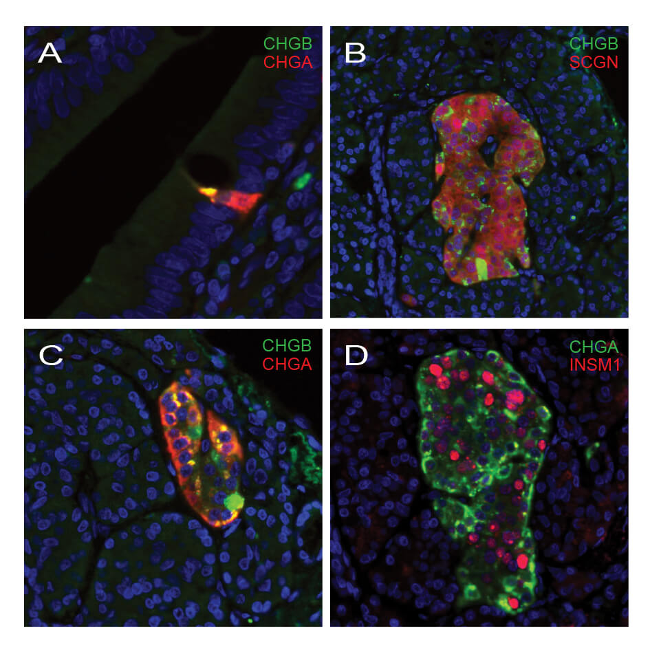 D. Human pancreas showing INSM1 and CHGA expression in pancreatic islet, using the Anti-INSM1 monoclonal antibody AMAb91727 (nuclear, red) and the Anti-CHGA polyclonal antibody HPA017369 (cytoplasmic, green). Nuclei are counterstained by DAPI (blue).