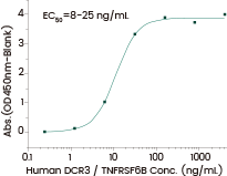 Recombinant Human DcR3/TNFRSF6B Protein, hFc Tag (Cat. No. 10224-H02B) captured on Protein A chip can bind Recombinant Human TL1A/TNFSF15 Protein (Trimer), His Tag (Cat. No. 17049-H07H2) with an affinity constant of 27.64 pM as determined in an SPR assay (Biacore T200) (Routinely tested).